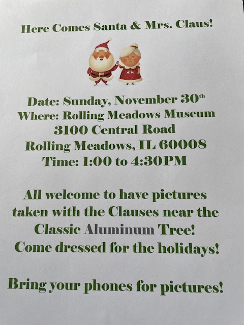 Sunday November 30 2025: From 1-4:30 pm, the RM museum will be hosting SANTA & MS. CLAUS at its holiday Open House.  All are invited to join us for holiday treats and to see the museum’s 1950’s holiday decorations. Photo opportunities will be available at the museum with its retro 1950’s aluminum Christmas tree! View the flyer- CLICK HERE.